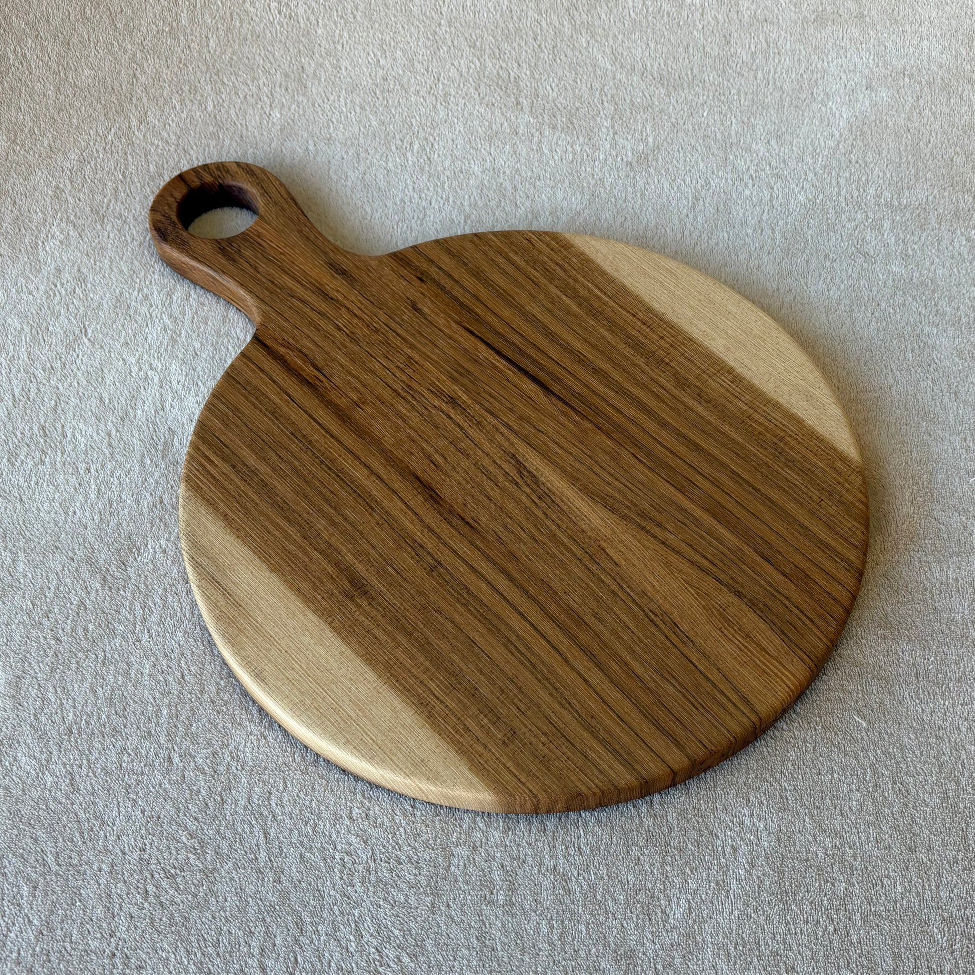 This handcrafted round cutting board showcases beautiful elm wood grain, offering a versatile kitchen essential and can be used on either side. The convenient integrated handle makes it easy to move from counter to table, while the food-safe finish ensures food safety. Perfect for slicing vegetables, serving cheese, or presenting charcuterie, this artisan piece combines practical functionality with natural wood elegance. Each board is uniquely crafted, making it a distinctive addition to any kitchen.
