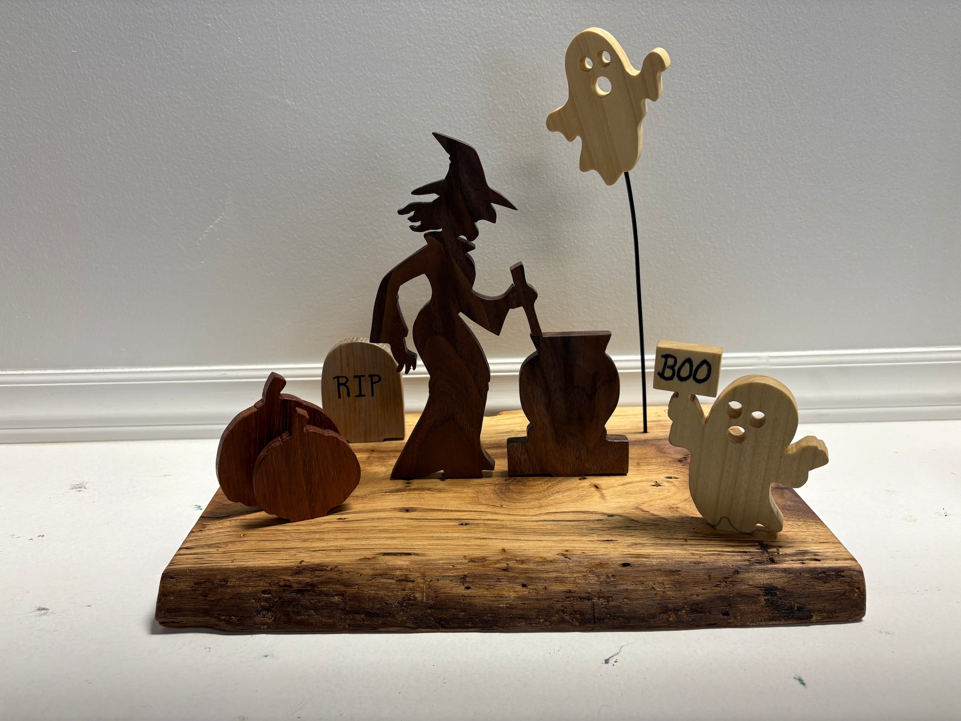 This charming Halloween decoration, handcrafted from walnut, poplar, sapele, and oak, brings a seasonal feel to your home. Designed with practicality, it easily disassembles for simple and convenient storage.