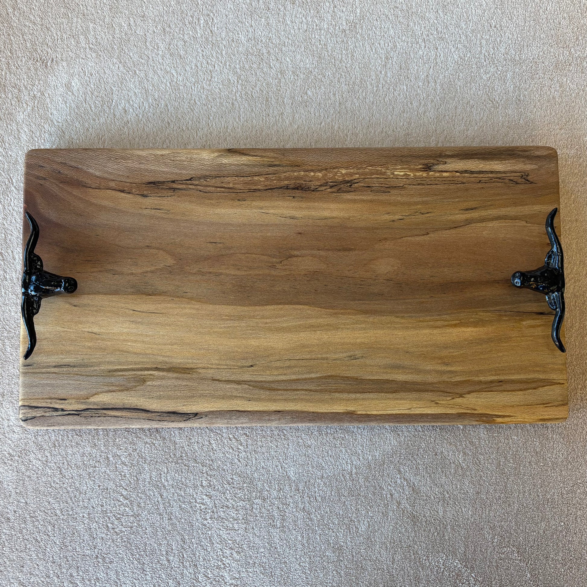 Handcrafted from river birch, this large serving board combines rustic charm with practical functionality. Featuring novelty cattle hardware handles for a distinctive farmhouse touch, it's perfect for entertaining or everyday use. The food-safe finish ensures your meals stay protected, while non-skid bumpers keep the board stable on any countertop or table. A versatile piece that brings warmth and character to your kitchen.
