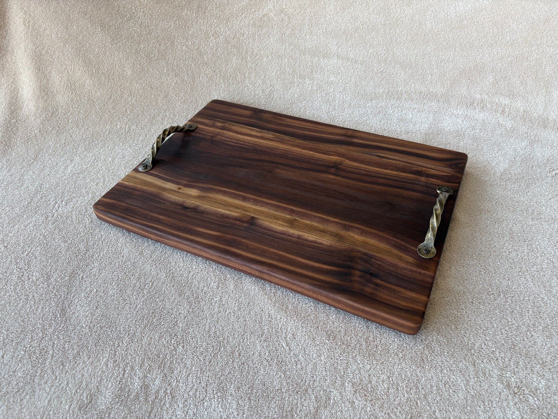 A handcrafted walnut serving board built for entertaining. Twisted hardware handles and protective bumpers make it easy to move and keep your table safe. The food-safe finish is perfect for presenting cheeses, charcuterie, cured meats, and appetizers. Built to last, it grows more beautiful with use and proper care.