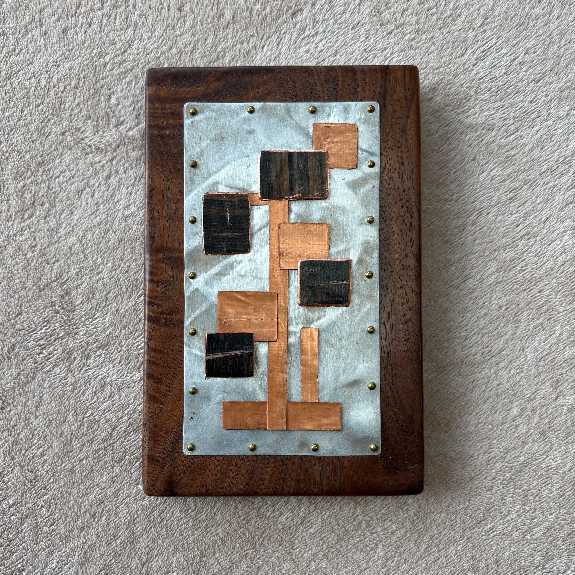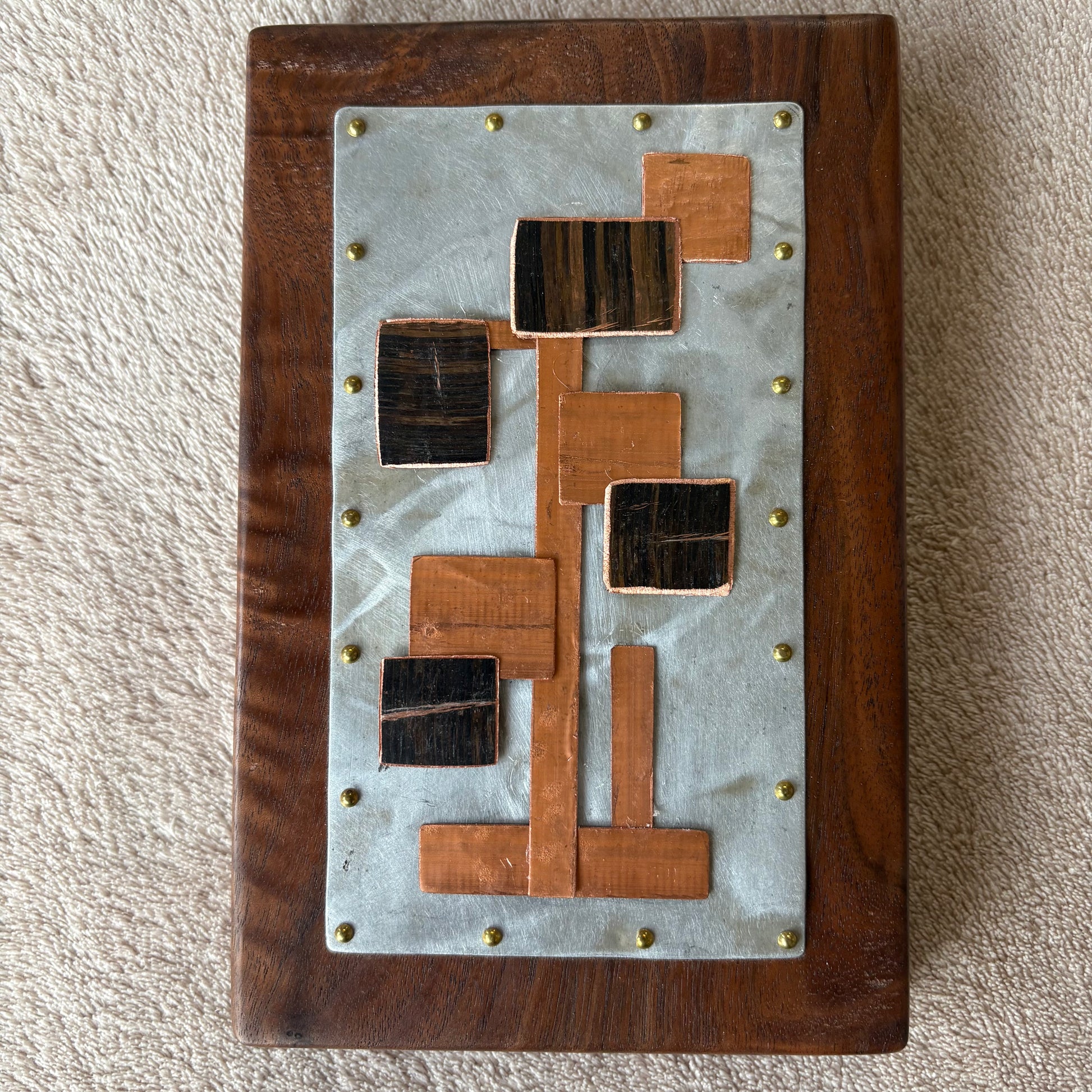 Add a fun twist to your home with this wall hanging featuring warm walnut wood, galvanized aluminum, copper, and brass. Whether on your wall or an easel, it brings a playful pop of style and eco-friendly charm to any room.
